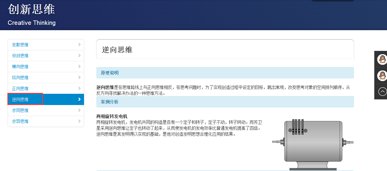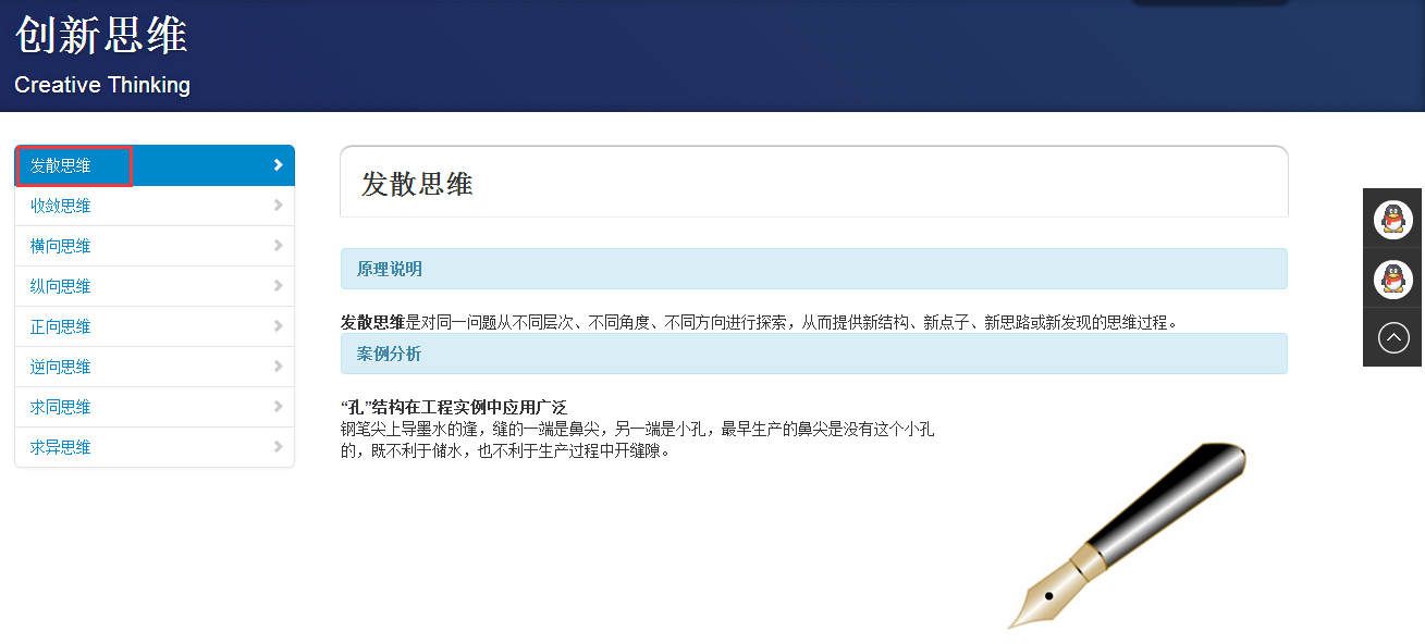 1、点击主菜单上的“创新思维”进入创新思维界面,浏览相关内容,如图1、图2所示。